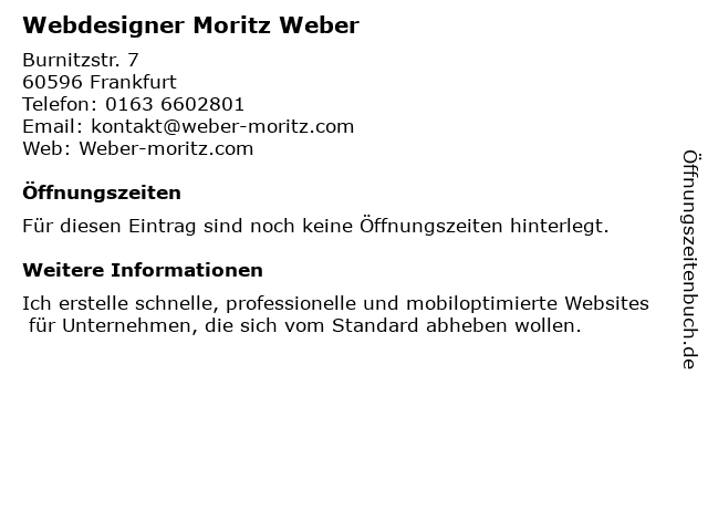 | Öffnungszeiten Webdesigner Moritz Weber in Frankfurt anzeigen | |
