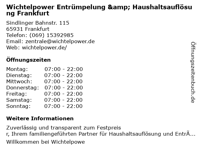 Branchen & Suchbegriffe zu Wichtelpower Entrümpelung & Haushaltsauflösung Frankfurt:besenreine räumung, büroauflösungen, dachbodenentrümpelung, entrümpelung, festpreisgarantie, firmenauflösungen, garagenentrümpelung, haushaltsauflösung, kellerentrümpelungen, messie-entrümpelung, nachlassauflösungen, praxisauflösungen, sperrmüllentsorgung, wichtelpower, wohnungsauflösungen |