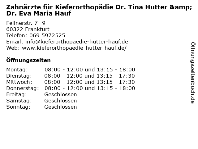 1 Zahnärzte für Kieferothopädie | Dr. T. Hutter & Dr. E. Hauf (Entfernung: 0,00 km) Fellnerstraße 7-9, 60322 Frankfurt 3 Psychotherapie Praxis Dr. phil. nat. Eva Frank-Noyon (Entfernung: 0,35 km) Meisengasse 9, 60313 Frankfurt am Main 4 B2 Zahnärzte + Labor - Dr. med. dent. Günther Zimmermann (Entfernung: 0,48 km) Biebergasse 2, 60313 Frankfurt 5 Kroner Bernd, Stickler Rainer K., Walter Michael, Stickler Eva Martina Rechtsanwälte und Notare (Entfernung: 0,76 km) Roßmarkt 21, 60311 Frankfurt 6 Dr.med.dent. Stefanie Brück, Zahnärzte am Goethehaus (Entfernung: 0,79 km) Weißadlergasse 15, 60311 Frankfurt |
