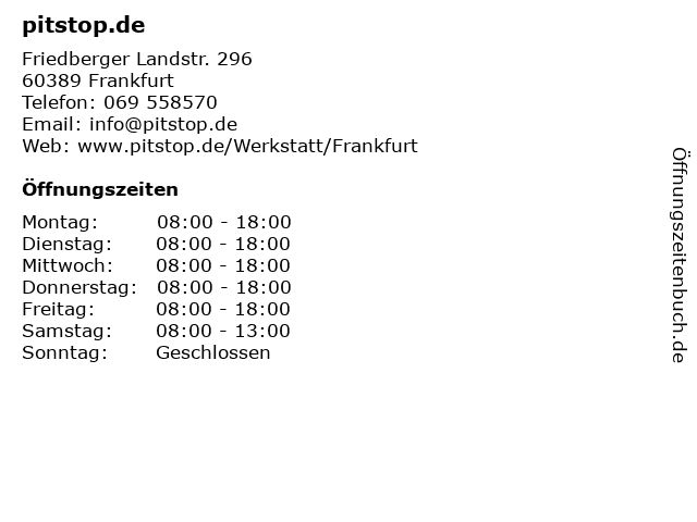 | Öffnungszeiten pitstop.de in Frankfurt anzeigen | |