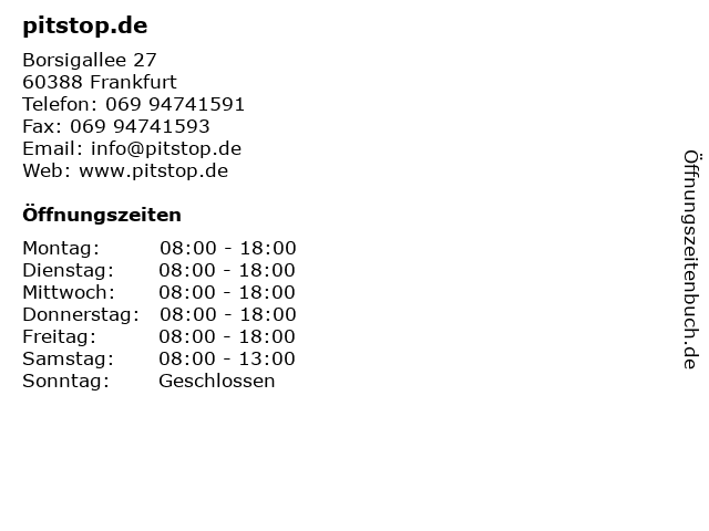 | Öffnungszeiten pitstop.de in Frankfurt anzeigen | |