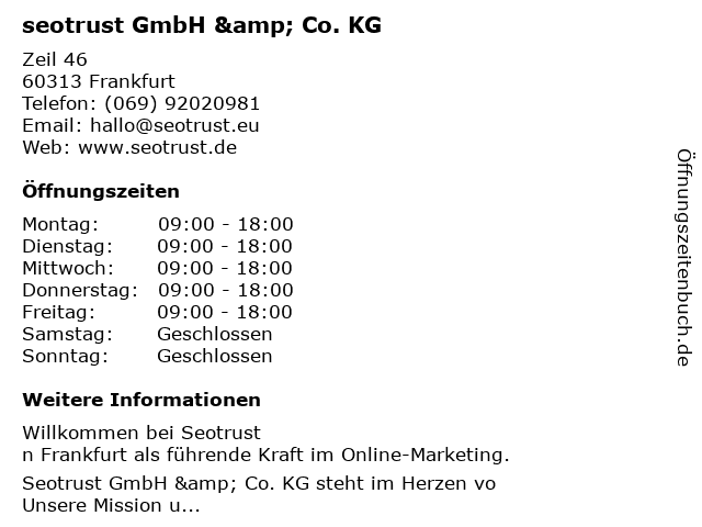 | Öffnungszeiten seotrust GmbH & Co. KG in Frankfurt anzeigen | |