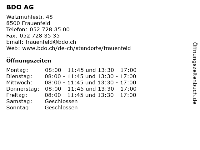 | Öffnungszeiten BDO AG in Frauenfeld anzeigen | |