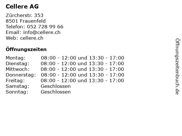 | Öffnungszeiten Cellere AG in Frauenfeld anzeigen | |