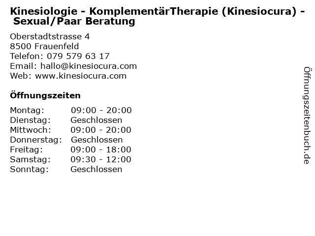 Branchen & Suchbegriffe zu Kinesiologie - KomplementärTherapie (Kinesiocura) - Sexual/Paar Beratung:beratung, beratungsstelle, eheberatung, kinesiocura, kinesiologie, komplementärtherapie, naturheilkunde, sexual/paar |