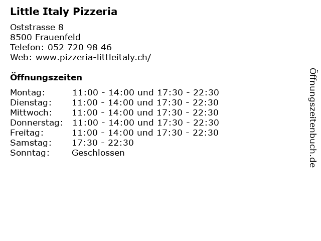 | Öffnungszeiten Little Italy Pizzeria in Frauenfeld anzeigen | |