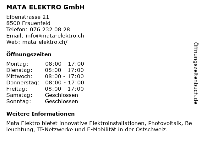 | Öffnungszeiten MATA ELEKTRO GmbH in Frauenfeld anzeigen | |