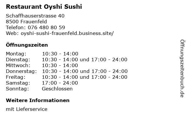 | Öffnungszeiten Restaurant Oyshi Sushi in Frauenfeld anzeigen | |