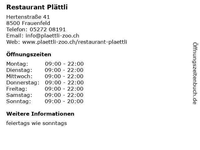 | Öffnungszeiten Restaurant Plättli in Frauenfeld anzeigen | |