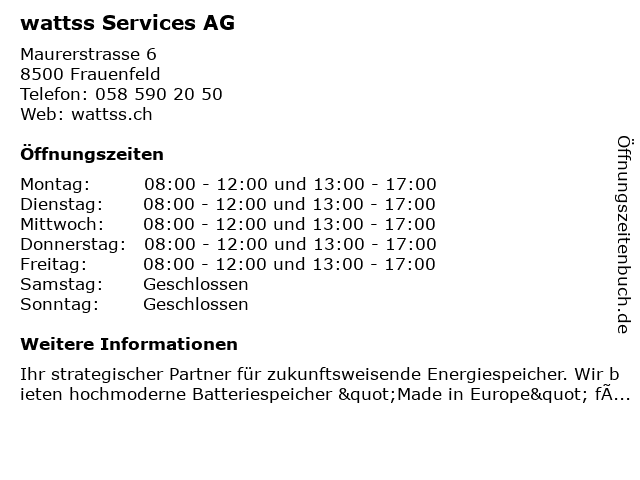 | Öffnungszeiten wattss Services AG in Frauenfeld anzeigen | |