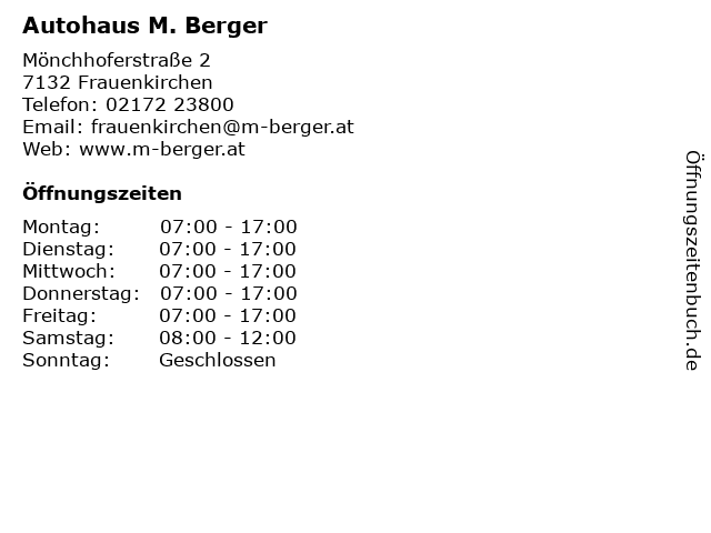 | Öffnungszeiten Autohaus M. Berger in Frauenkirchen anzeigen | |
