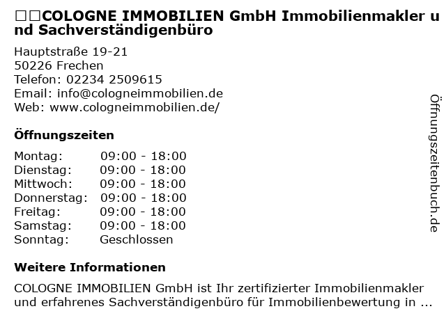 1 immobilienmakler & projektentwicklung hardy fuß (Entfernung: 0,47 km) Kölner Straße 72, 50226 Frechen 6 |