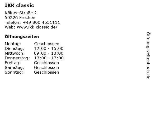 | Öffnungszeiten IKK classic in Frechen anzeigen | |