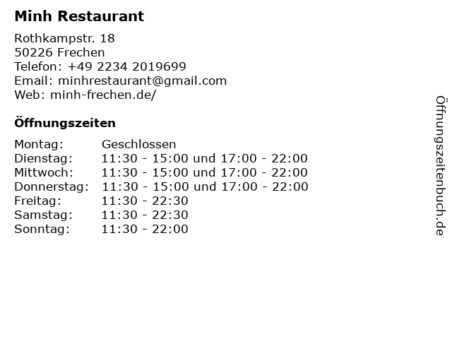 | Öffnungszeiten Minh Restaurant in Frechen anzeigen | |