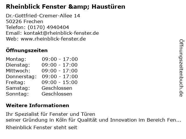 1 H. Schaaf Glas- und Aluminiumbau Fenster Türen-Wintergärten e. K. B. Hackner-Schaaf (Entfernung: 1,45 km) Burgstr. 30, 50226 Frechen 2 Rüdiger Johnen Fenster- Sonnenschutztechnik e.K. (Entfernung: 1,60 km) Hauptstr. 181 -183, 50226 Frechen 3 OBI Türen und Fenster im Markt Köln-Marsdorf (Entfernung: 1,79 km) Emmy-noether-straße 12, 50858 Köln 6 |