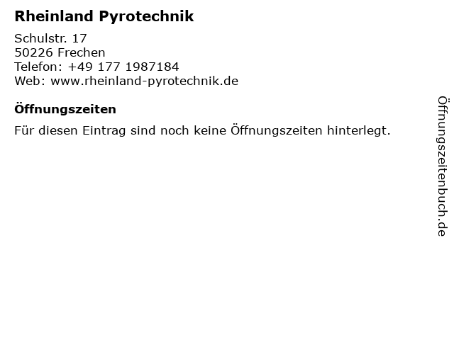 | Öffnungszeiten Rheinland Pyrotechnik in Frechen anzeigen | |