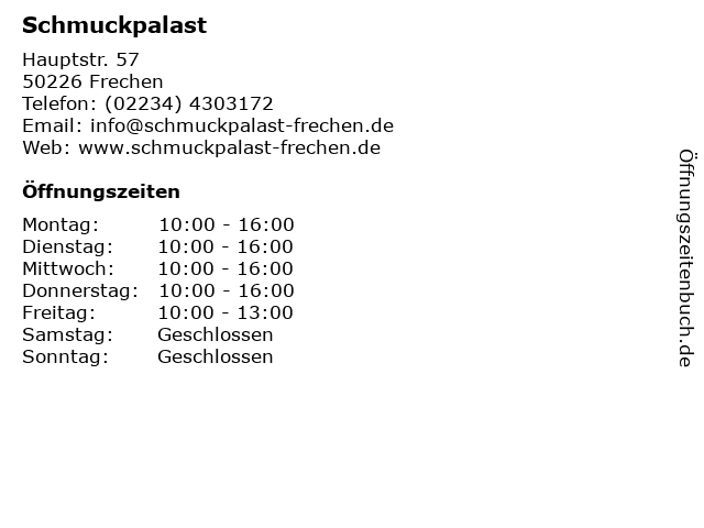 | Öffnungszeiten Schmuckpalast in Frechen anzeigen | |