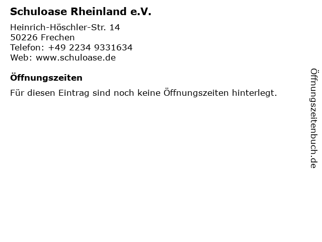 | Öffnungszeiten Schuloase Rheinland e.V. in Frechen anzeigen | |