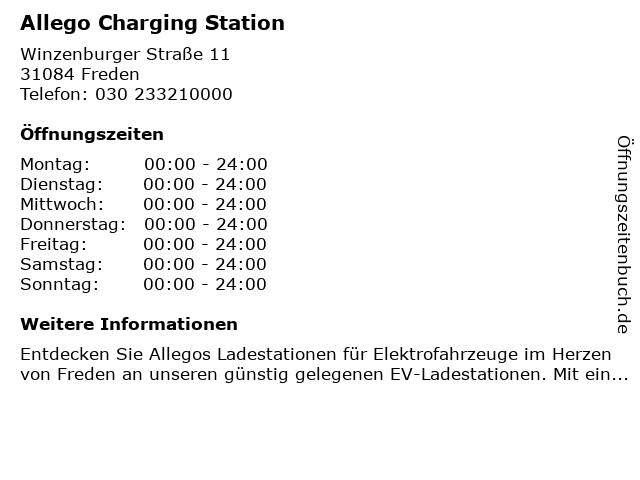 | Öffnungszeiten Allego Charging Station in Freden anzeigen | |