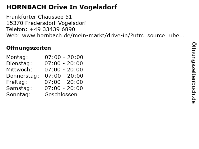 1 HORNBACH Gartencenter Vogelsdorf (Entfernung: 0,00 km) Frankfurter Chaussee 51, 15370 Fredersdorf-Vogelsdorf 2 HORNBACH Gartencenter Vogelsdorf (Entfernung: 0,00 km) Frankfurter Chaussee 51, 15370 Fredersdorf-Vogelsdorf 3 HORNBACH Gartencenter Vogelsdorf (Entfernung: 0,00 km) Frankfurter Chaussee 51, 15370 Fredersdorf-Vogelsdorf 6 |