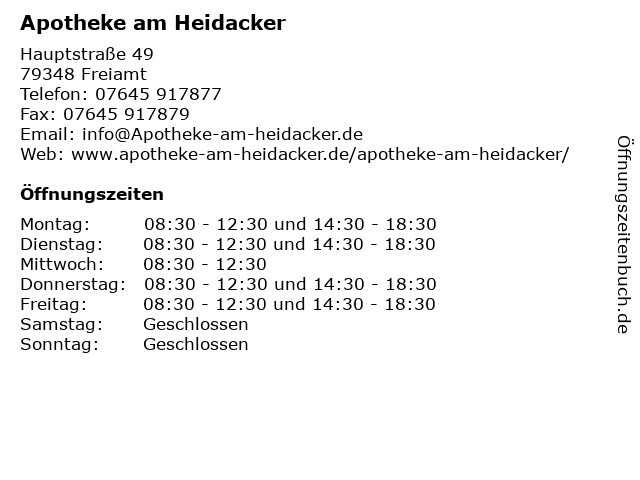 | Öffnungszeiten Apotheke am Heidacker in Freiamt anzeigen | |