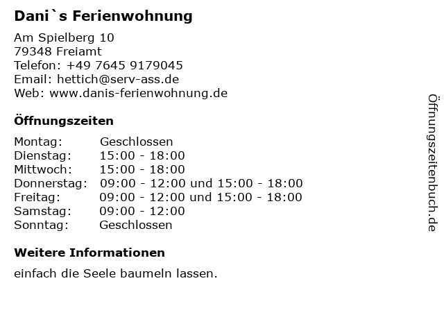 | Öffnungszeiten Dani`s Ferienwohnung in Freiamt anzeigen | |