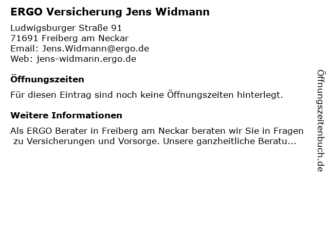 | Öffnungszeiten ERGO Versicherung Jens Widmann in Freiberg am Neckar anzeigen | |
