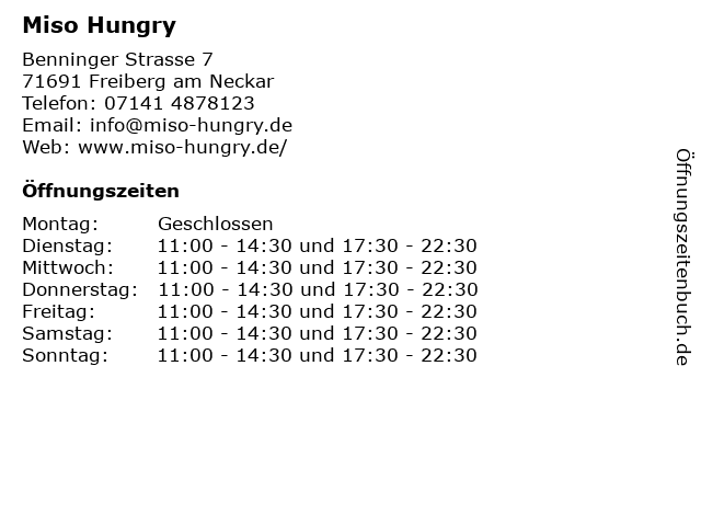 | Öffnungszeiten Miso Hungry in Freiberg am Neckar anzeigen | |