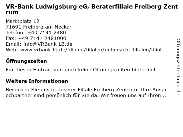 | VR-Bank Ludwigsburg eG, Beraterfiliale Freiberg Zentrum anrufen | |