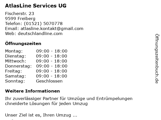 | Öffnungszeiten AtlasLine Services UG in Freiberg anzeigen | |