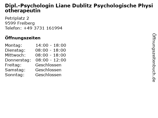 Branchen & Suchbegriffe zu Dipl.-Psychologin Liane Dublitz Psychologische Physiotherapeutin:dipl., dublitz, liane, physiotherapeutin, physiotherapie, psychologin, psychologische |