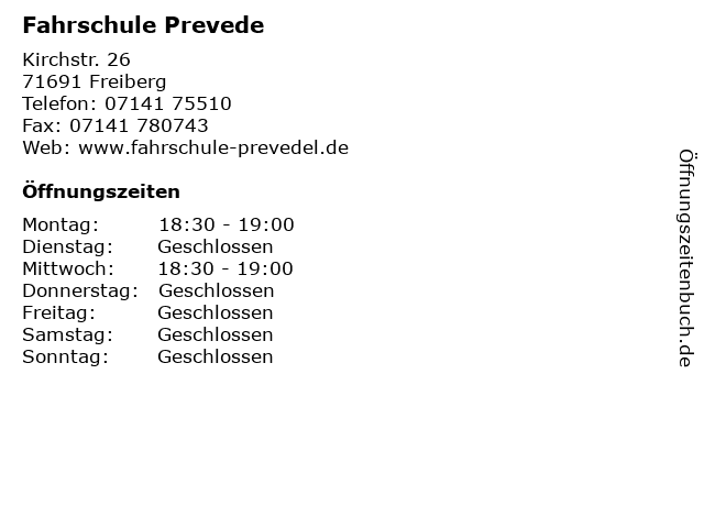 | Öffnungszeiten Fahrschule Prevede in Freiberg anzeigen | |