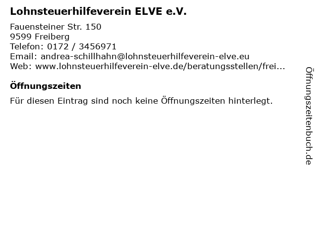 3 4 Lohnsteuerhilfeverein ELVE e.V. Beratungsstelle (Entfernung: 2,98 km) Hauptstr. 38, 09600 Weißenborn/Erzgeb 5 Lohnsteuerhilfeverein ELVE e.V. in Freiberg (Entfernung: 3,30 km) Ziolkowskistraße 12, 09599 Freiberg 6 |