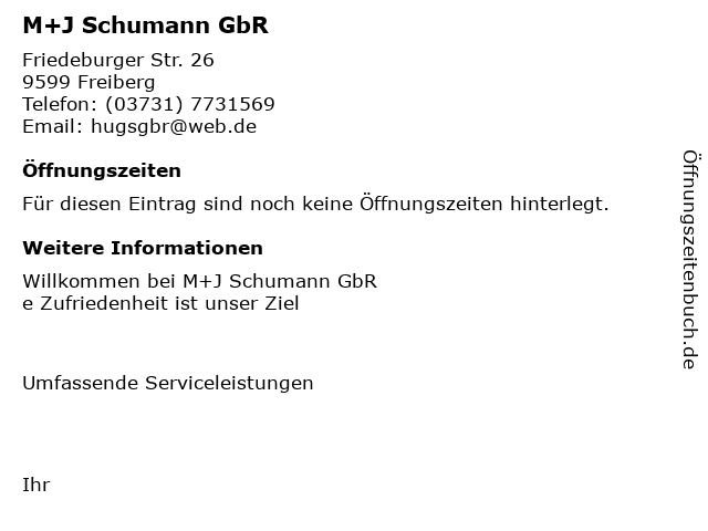| Öffnungszeiten M+J Schumann GbR in Freiberg anzeigen | |