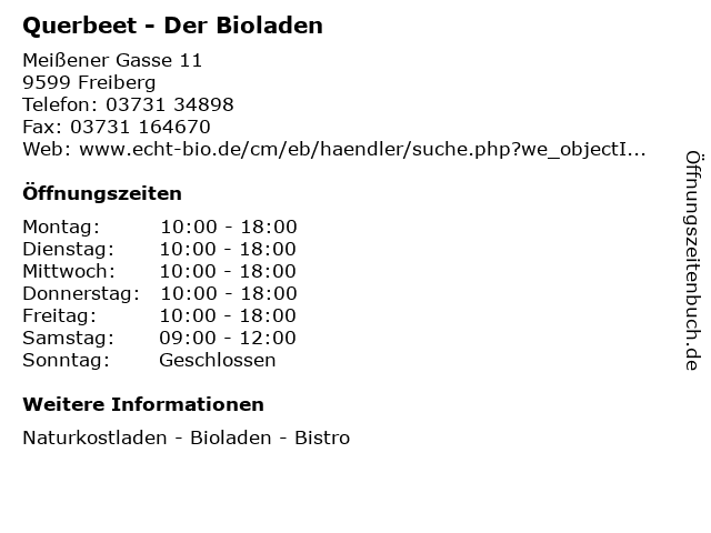 | Öffnungszeiten Querbeet - Der Bioladen in Freiberg anzeigen | |