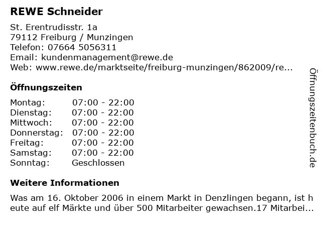 | Öffnungszeiten REWE Schneider in Freiburg / Munzingen anzeigen | |