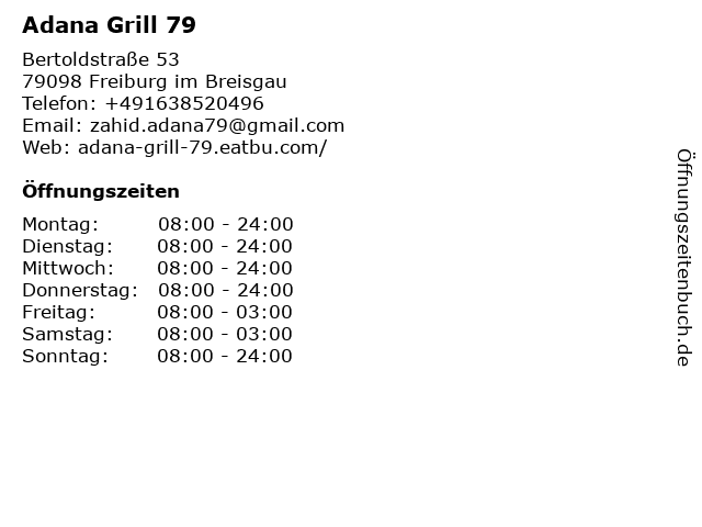 | Öffnungszeiten Adana Grill 79 in Freiburg im Breisgau anzeigen | |