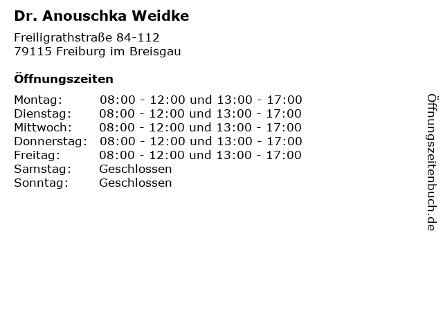 | Öffnungszeiten Dr. Anouschka Weidke in Freiburg im Breisgau anzeigen | |