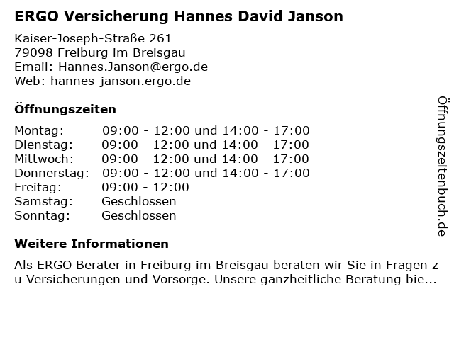 | Öffnungszeiten ERGO Versicherung Hannes David Janson in Freiburg im Breisgau anzeigen | |