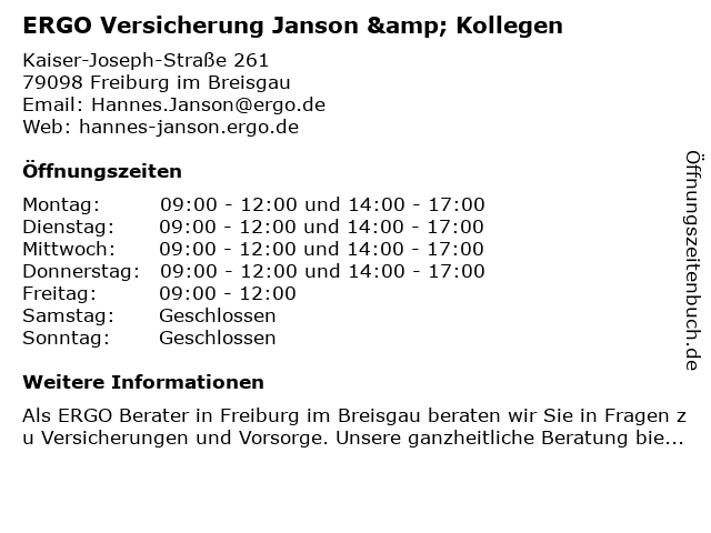 | Öffnungszeiten ERGO Versicherung Janson & Kollegen in Freiburg im Breisgau anzeigen | |