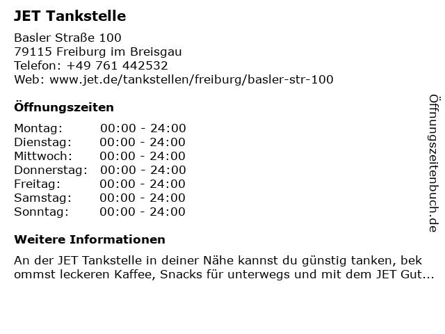 | Öffnungszeiten JET Tankstelle in Freiburg im Breisgau anzeigen | |