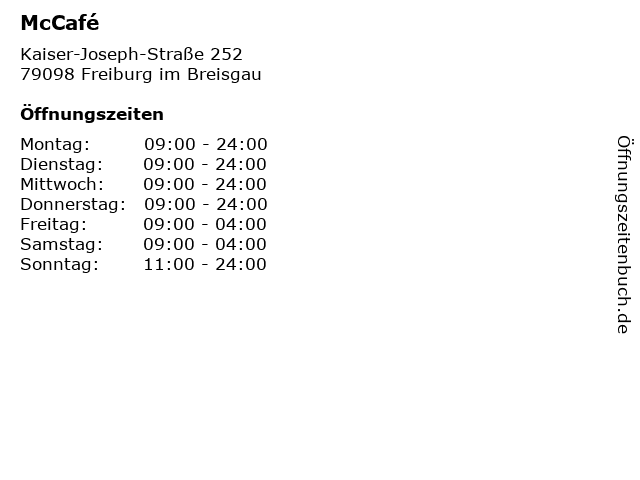 | Öffnungszeiten McCafé in Freiburg im Breisgau anzeigen | |