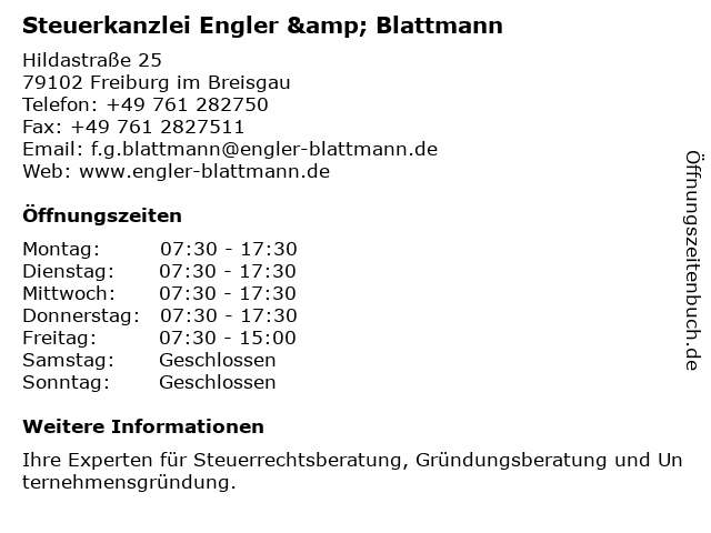 1 Engler, Blattmann, Buhl, Potass & Kollegen Steuerberater Wirtschaftsprüfer Rechtsanwalt (Entfernung: 0,43 km) Talstr. 1, 79102 Freiburg 6 |