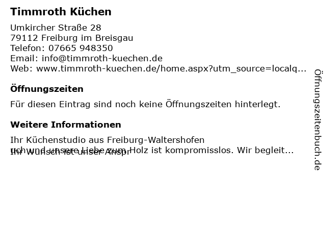 | Öffnungszeiten Timmroth Küchen in Freiburg im Breisgau anzeigen | |