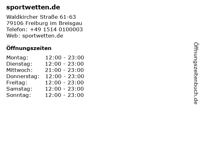 | Öffnungszeiten sportwetten.de in Freiburg im Breisgau anzeigen | |