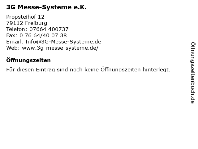 | Öffnungszeiten 3G Messe-Systeme e.K. in Freiburg anzeigen | |