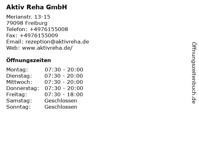 | Öffnungszeiten Aktiv Reha GmbH in Freiburg anzeigen | |