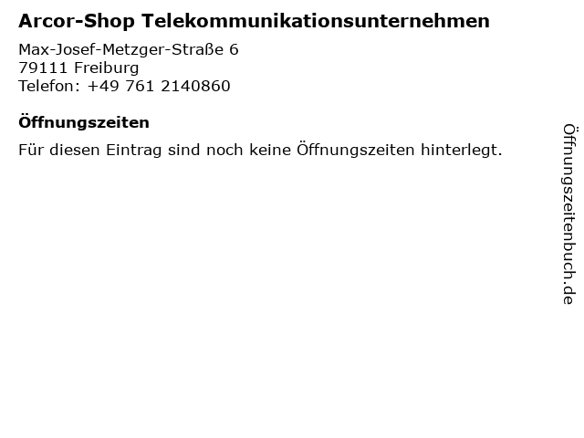 1 Schmucks Telefon & Computerlösungen Telekommunikationsunternehmen (Entfernung: 0,00 km) Max-Josef-Metzger-Straße 6, 79111 Freiburg 2 Arcor Store Enrico Store Telekommunikationshandel (Entfernung: 13,14 km) Schillerstr. 21, 79312 Emmendingen 6  |