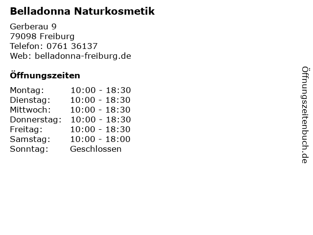 | Öffnungszeiten Belladonna Naturkosmetik in Freiburg anzeigen | |