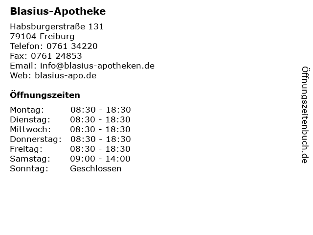 | Öffnungszeiten Blasius-Apotheke in Freiburg anzeigen | |